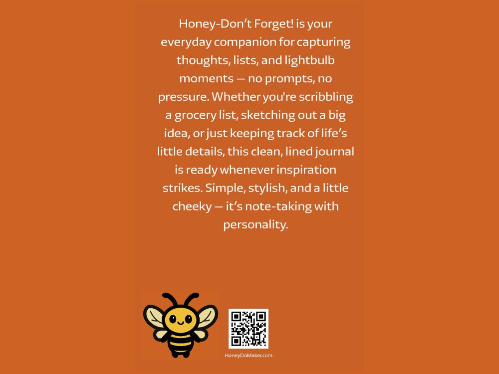 Tired of forgetting the little things? Meet your new everyday sidekick—Honey-Don’t Forget!!!, a fun and functional journal created by Honey-Do Maker. Whether you’re jotting down quick reminders, to-do lists, shopping notes, or just keeping track of ideas, this lined notebook is designed to make organization a little easier—and a lot more enjoyable.